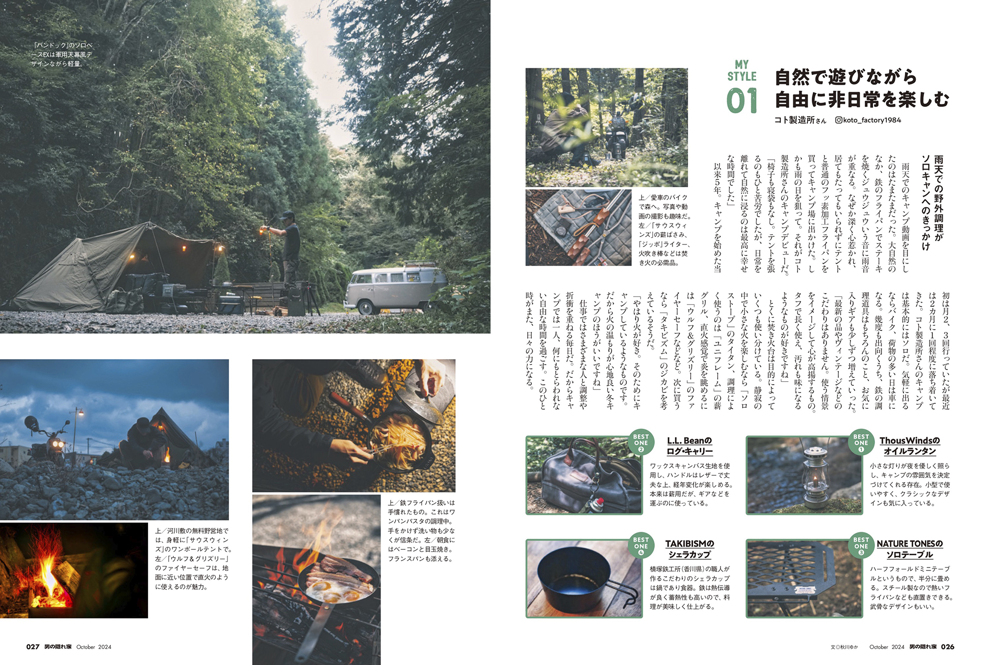 デザイン性に優れていても、意外と使い勝手が悪かったり、はたまた思った以上に便利だったり。仲間から譲ってもらったもの、家族との思い出が詰まったもの。「モノと人」──そこには切っても切れない何かがあって、キャンブギアもまた然り。普段からギアに対して並々ならぬ思いをもつキャンバーたちの愛用品を紹介しつつ、キャンブスタイルにも迫る。
