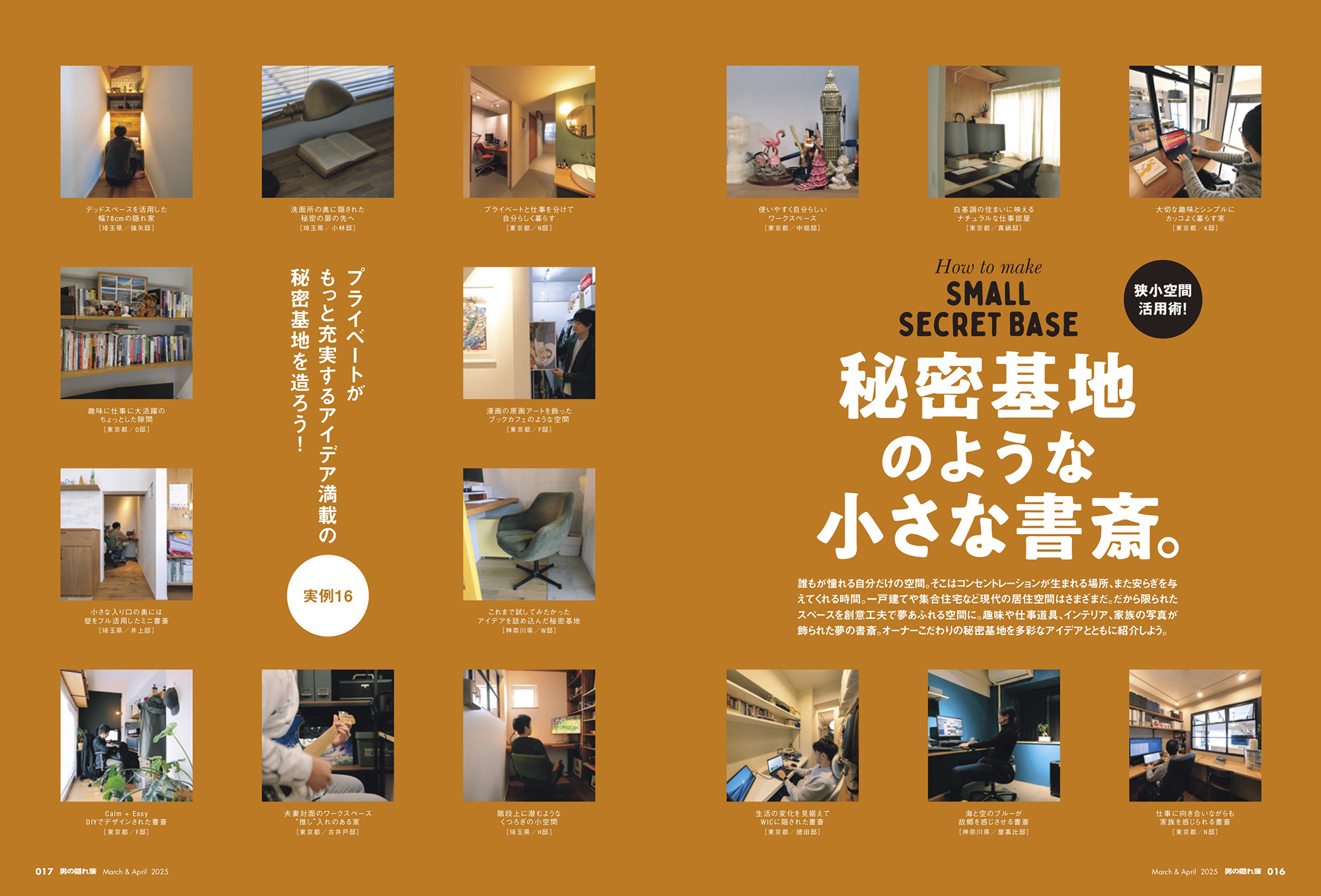 誰もが憧れる自分だけの空間。そこはコンセントレーションが生まれる場所、また安らぎを与えてくれる時間。一戸建てや集合住宅など現代の居住空間はさまざまだ。だから限られたスペースを創意工夫で夢あふれる空間に。趣味や仕事道具、インテリア、家族の写真が飾られた夢の書斎。オーナーこだわりの秘密基地を多彩なアイデアとともに紹介しよう。