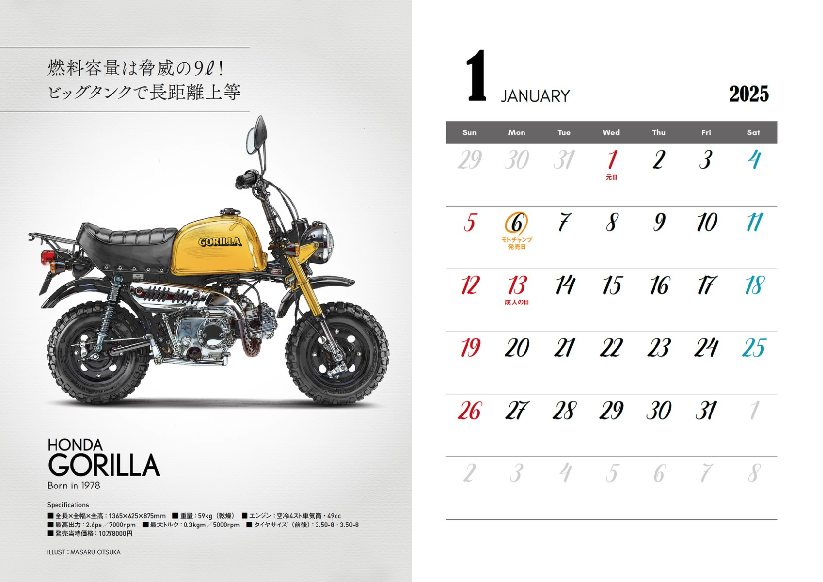 昭和・平成の名車が、リアルでノスタルジックな雰囲気で描かれている、バイク好きには堪らない仕上がりです。各車両の発売当初のスペックも掲載されているのもおすすめポイント。