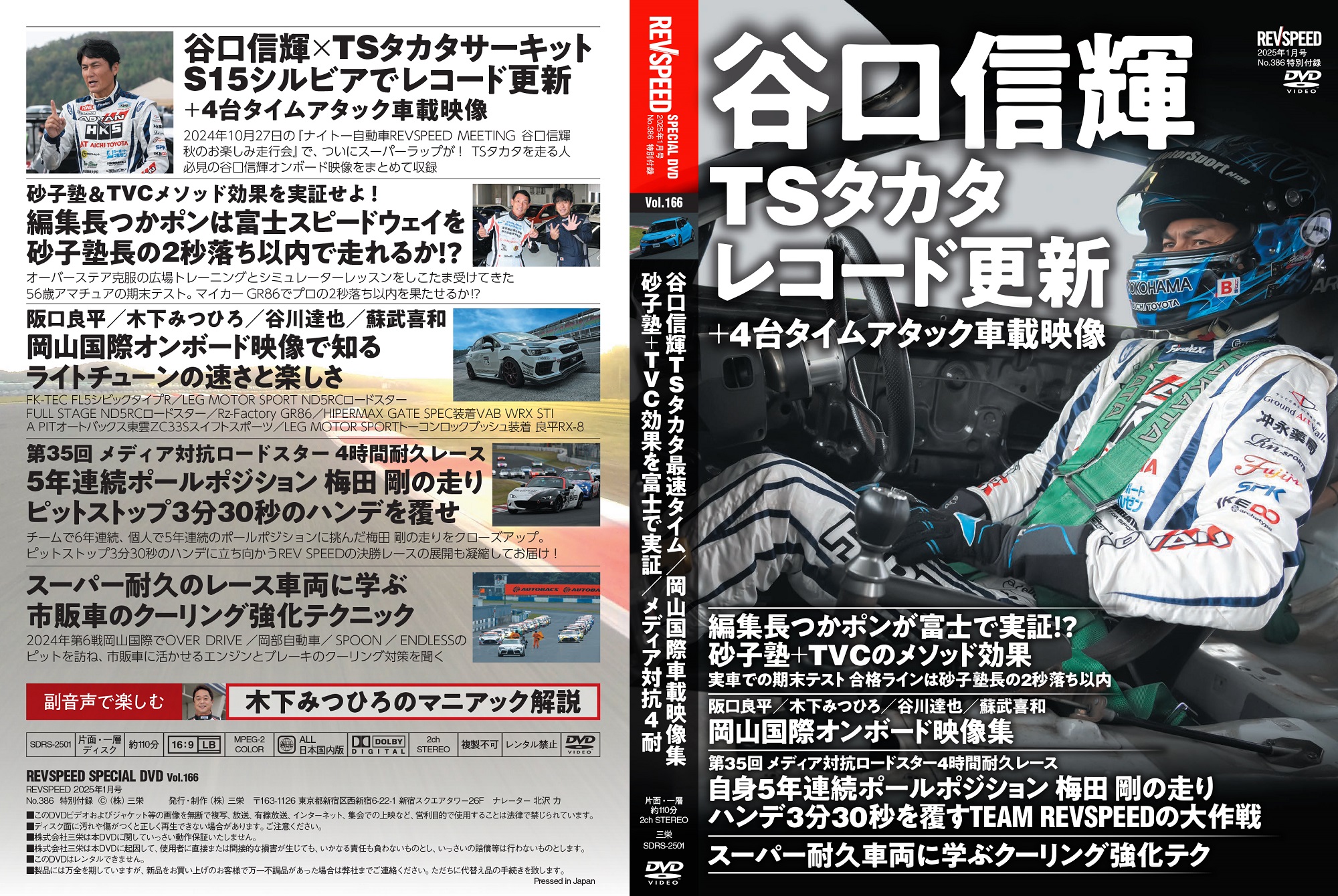 特別付録DVDは『谷口信輝 TSタカタのレコード更新+4台タイムアタック車載映像』『砂子塾+TVCのメソッド効果を実証せよ! 編集長つかポンが砂子塾長に挑む! 富士スピードウェイで期末テスト』『阪口良平/木下みつひろ/谷川達也/蘇武喜和 岡山国際オンボード映像で知るライトチューンの速さと楽しさ』『第35回 メディア対抗ロードスター4時間耐久レース 梅田 剛の5年連続ポールポジション予選オンボード映像+ピットストップ3分30秒のハンデを覆せ! TEAM REVSPEEDの必勝大作戦』『スーパー耐久レース車両に学ぶクーリング強化テクニック』の映像企画5本/総尺110分。副音声はお馴染み『木下みつひろマニアック解説』です。