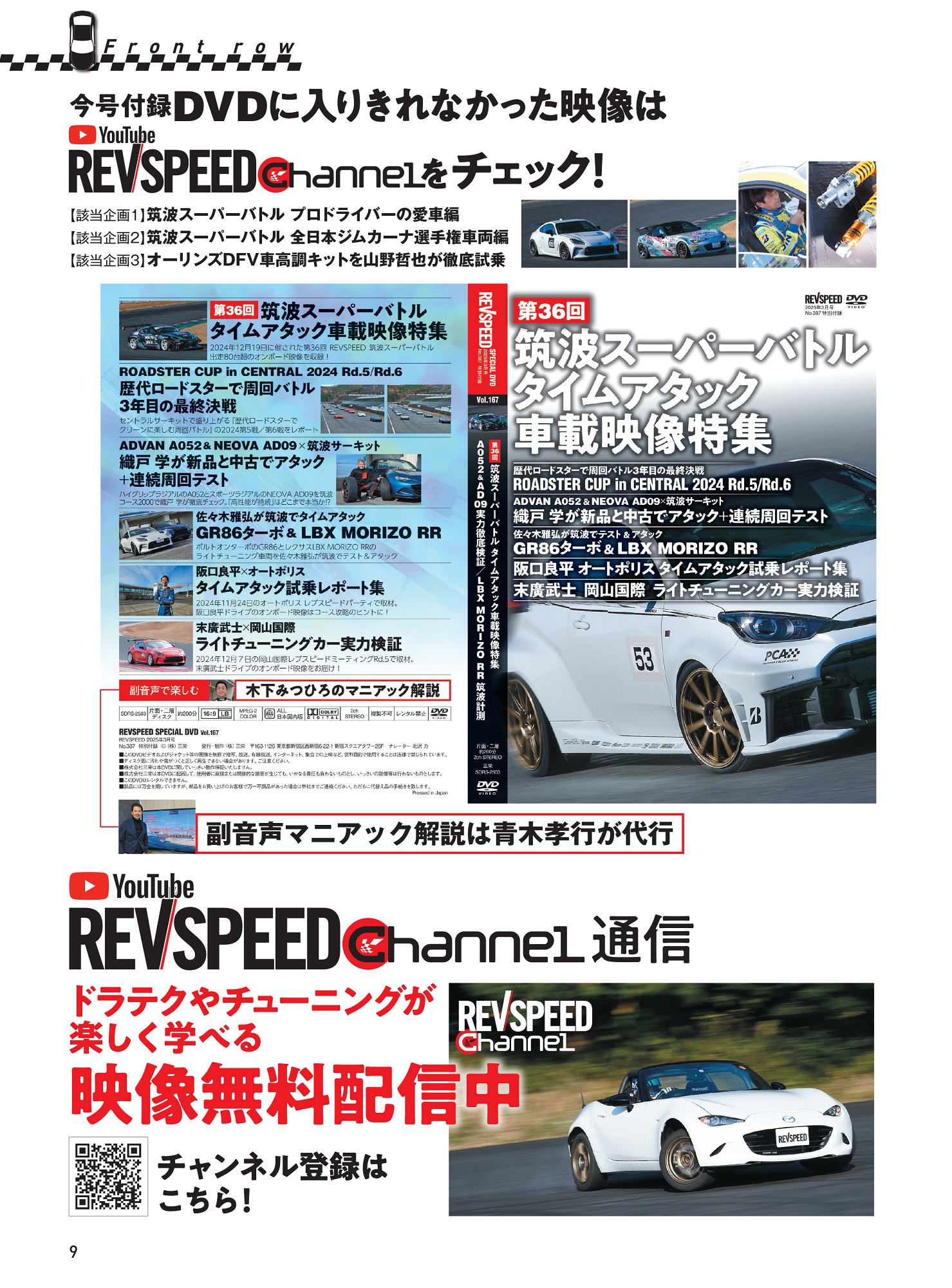 付録DVDは2層203分の特盛り版。特集『第36回 筑波スーパーバトル』はプロドライバーのオンボード映像を満載してお届けしています! 『Roadster CUP in CENTRAL CIRCUIT 2024 Rd.5/Rd.6』『ADVAN A052とNEOVA AD09の高性能が長持ちはどこまで本当か? 織戸 学が筑波で徹底テスト』『ボルトオンターボGR86と早くもライトチューンのLEXUS LBX MORIZO RR 佐々木雅弘×筑波タイムアタック』『オートポリス レブスピードパーティ 阪口良平オンボード映像集』 『岡山国際レブスピードミーティング 末廣武士オンボード映像集』 も見応えタップリの構成となっています。木下みつひろの代役 青木孝行の副音声マニアック解説もお楽しみください。