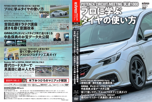 付録DVDはPOTENZA CIRCUIT MEETING 筑波1000より『プロに学ぶタイヤの使い方』でスタート。佐々木雅弘/井口卓人/蒲生尚弥/久保凜太郎/平峰一貴のオンボード映像&有効アドバイスは必見です。オートポリスREVSPEED Partyからは『吉田広樹 速さを磨く意識改革』をお届け! スーパーGT スーパー耐久 GR86/BRZ Cupで勢いに乗る努力派ドライバーが初登場! マイカーのGR86とFL5シビックタイプRで全国各地のサーキットを走りまくる中島保典は『GR86/FL5シビックタイプRのサーキット走行で知っておきたい情報あれこれ』を一挙大公開! その他、『安くて使いやすいアストロプロダクツ工具ガイド』や『Roadster CUP in CENTRAL CIRCUIT 歴代ロードスターで真面目に遊ぶ人たち』を加えた企画5本立て、総尺120分の映像です。副音声『木下みつひろマニアック解説』も付いています。