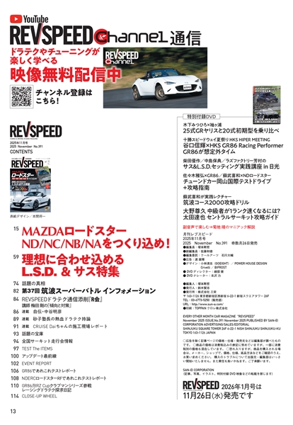誌面特集は『MAZDAロードスターをつくり込め!』と『L.S.D.&サスキット 持ち味とセッティング幅を探る』。スポーツドライビングの素材として大人気の歴代ロードスター。より楽しむためのチューニング/リフレッシュ情報を大公開! L.S.D. & サスキットは各社の人気アイテムの特徴を改めて紹介。カスタマーの理想に近づけていく『合わせ込み方』についても言及しています。