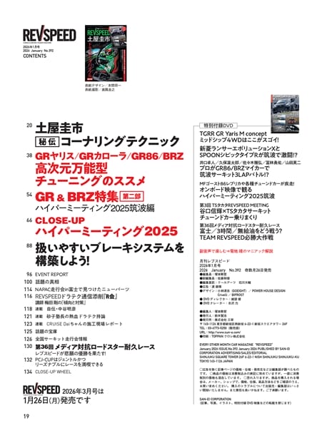 巻頭特集は『土屋圭市ドライビングバイブル 最新版』です。レース&ドリフトのレジェンドとして、これまで語ってきたドライビングテクニックと、現在の若手トップドライバーから吸収した「いまどきのクルマ&タイヤの走らせ方」を18ページに集約。ドリキンが伝えたい『攻めの走り』の本質がわかります。車種別特集は『GRヤリス/GRカローラ/GR86/BRZ』です。ベース車自体が年々進化を遂げていますが、アフターパーツメーカー、プロショップもそれに追従。最新型用だけでなく、初期型用も含めて、魅力的なパーツやメニューを紹介します。先代ZN6 86/ZC6 BRZの新たな可能性にも言及。そのほか、『ブレーキチューニング最前線』『ハイパーミーティング2025筑波エキサイティングレポート』を特集。