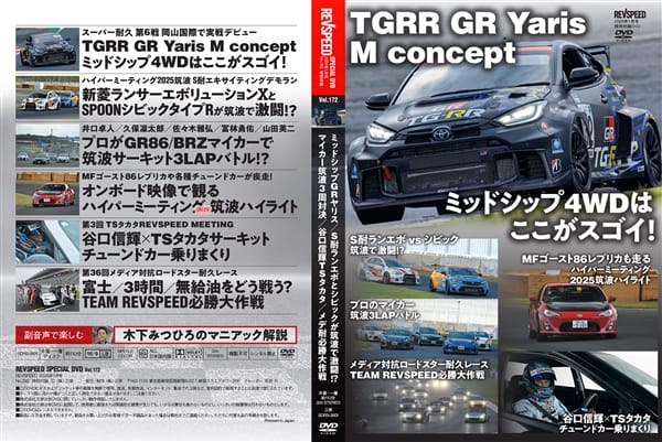 付録DVDは『S耐レース車両TGRR GR Yaris M concept ミッドシップ4WDはここがスゴイ!』『井口卓人/久保凜太郎/佐々木雅弘/冨林勇佑/山田英二がGR86/BRZマイカーで筑波サーキット3LAPバトル?』『S耐ランエボⅩ/シビックタイプR筑波サーキットエキサイティングデモラン』『車載映像で観るハイパーミーティング2025筑波ハイライト』『谷口信輝×TSタカタサーキット チューンドカー乗りまくり』『第36回メディア対抗ロードスター耐久レースTEAM REVSPEED必勝大作戦』の6本立て総尺110分。副音声『木下みつひろのマニアック解説』も付いています。