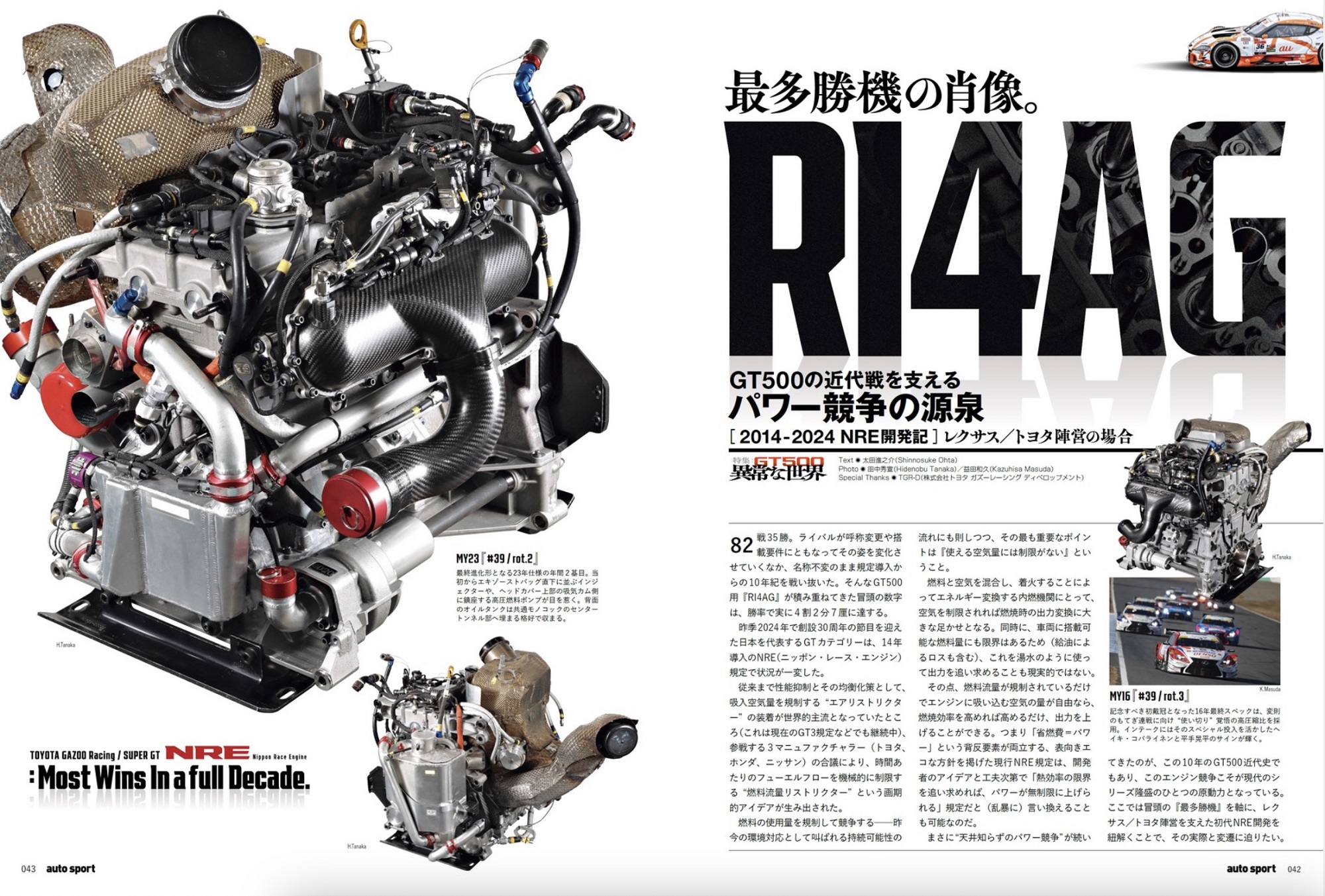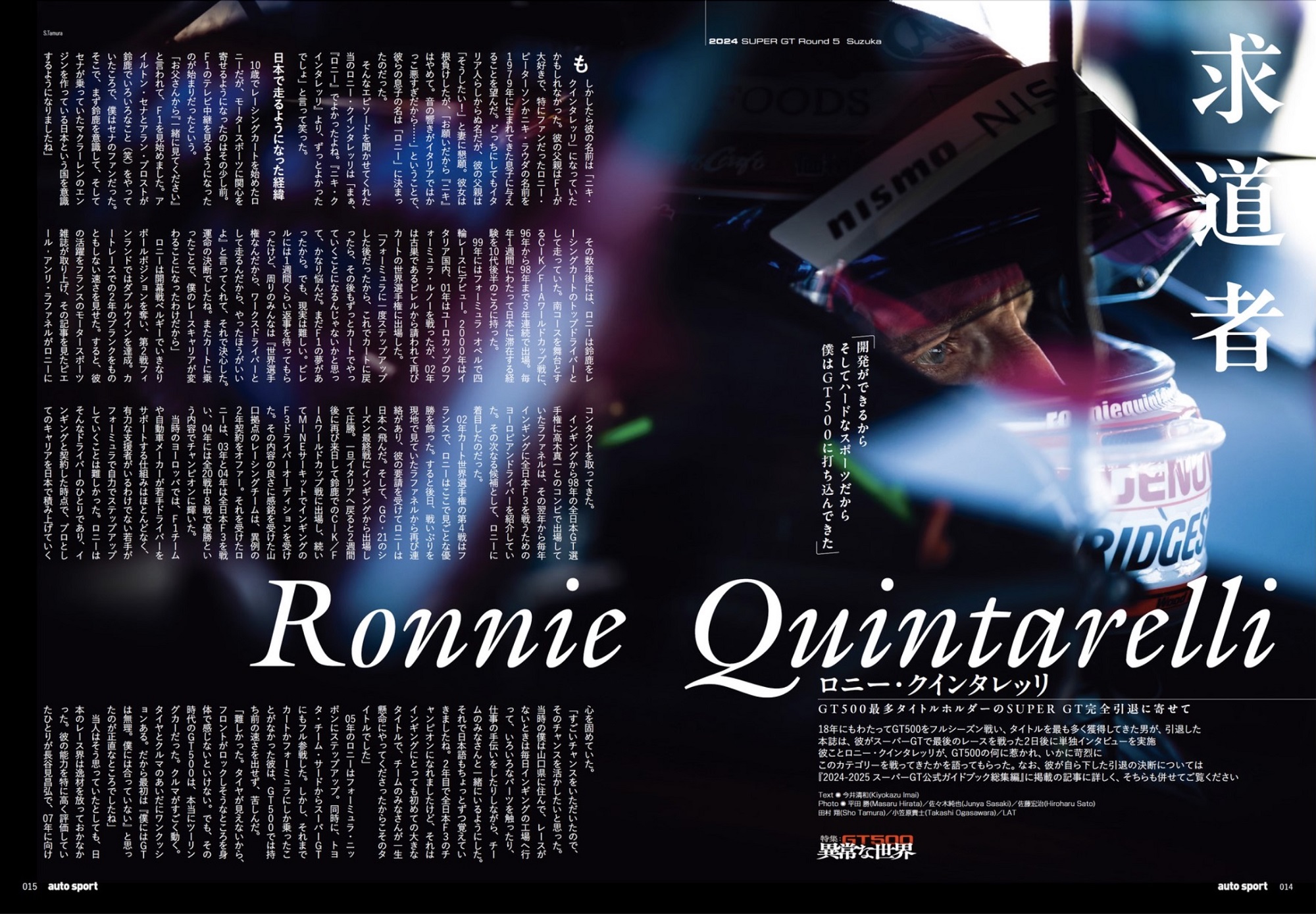 まずは24年限りで引退したGT500最多戴冠王者、ロニー・クインタレッリのロングインタビューを収録。また「THE TURNING POINT」として10年10度の戴冠劇を回想、その契機となったキーファクトに着目して「読ませる」構成としました。さらに10年間を支えたNREエンジン、その最多勝機種であるレクサス/トヨタ「RI4AG」の細部に迫り、美麗なパーツディテールカットと共にその強さの源泉を探っています。ほかにも「現代GT500ドライバーの条件」を語る土屋圭市×脇阪寿一スペシャル対談、大湯都史樹・平峰一貴・太田格之進へのインタビューに加えて「GT10大ニュース」といった記事も。トヨタの豊田章男会長の子息であり、ルーキーレーシングのGMを務める豊田大輔氏へのインタビューも収録しています。