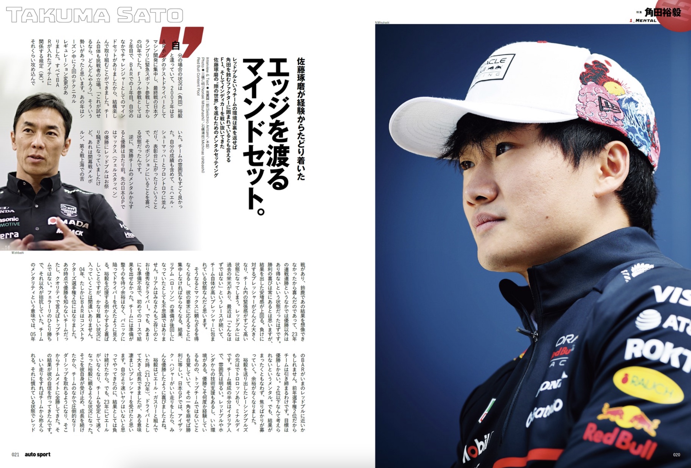 特集では「角田裕毅 5つの進化論」と銘打ち、佐藤琢磨が語る「メンタル」、かつてのライバル大湯都史樹が分析する「ドライビング」、日本時代の師が回想する「エンジニアリング知識」、6Gを超えをいなす強靭な体づくりを科学する「フィジカル」、生まれ変わったと評され成長が感じられる「コミュニケーション能力」という切り口で角田選手の現在地を徹底解剖。レギュラー参戦5年目となる角田選手の成長ぶりをフィーチャーしました。