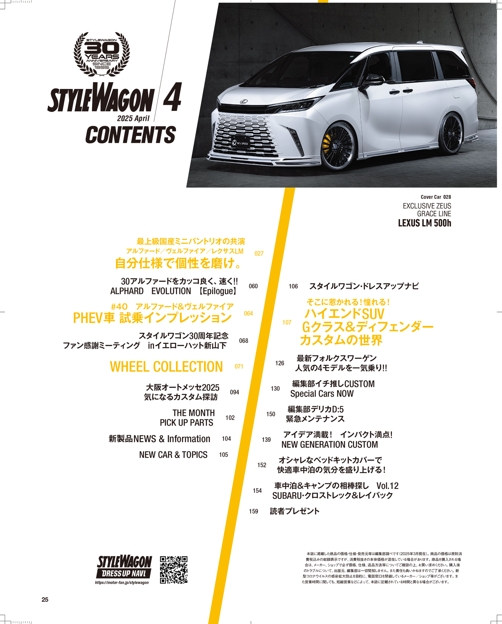 スタイルワゴン4月号では、ミニバンキングのアルファード&ヴェルファイアを大特集。しかも今回はさらにラグジュアリーなレクサスLMデモカーも掲載中。車両価格的にはかなりハイブランド化してしまったミニバンだが、その世界観、高級感やカッコ良さを要チェックしてほしい。そして新発売となったアルヴェルのPHEV車も試乗インプレッション。もちろん他にも大阪オートメッセのレポートや、唯一無二的なアイデアが満載の学生カスタムも特集。人気のスバルSUVで雪中車中泊企画なども掲載中。さらには、SUVシーンのハイエンドカーとして人気のメルセデスベンツGクラスやディフェンダーのカスタマイズもクローズアップ。憧れの高級SUVをさらにスタイルアップしているので要注目だ。
