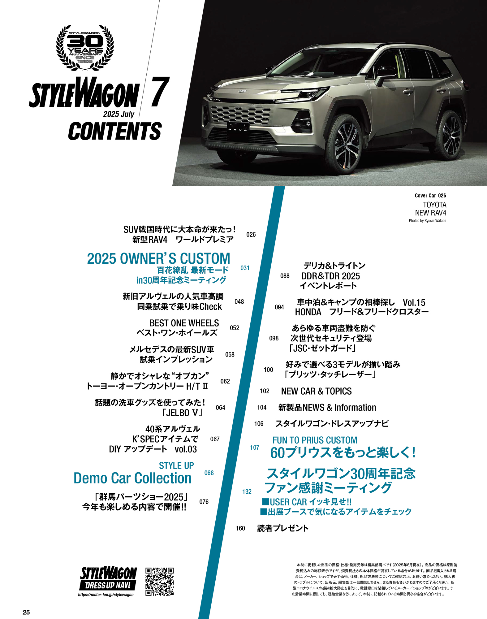 ついに世界的人気車の「RAV4」がフルモデルチェンジ。そのワールドプレミアの模様、そして新たなRAV4の魅力をクローズアップ。日本仕様ではガソリン車がなくなり、ハイブリッド車のみの設定となっているのも話題のひとつ。そして巻頭特集では、いまどきのユーザーカーがどんなカスタマイズをしているのか? じっくりと研究できるオーナーズカスタムを全力取材。スタワゴ30周年記念のイベントとして開催されたミーティングに集まってくれたクルマをいろいろな角度からフューチャーしているぞ。