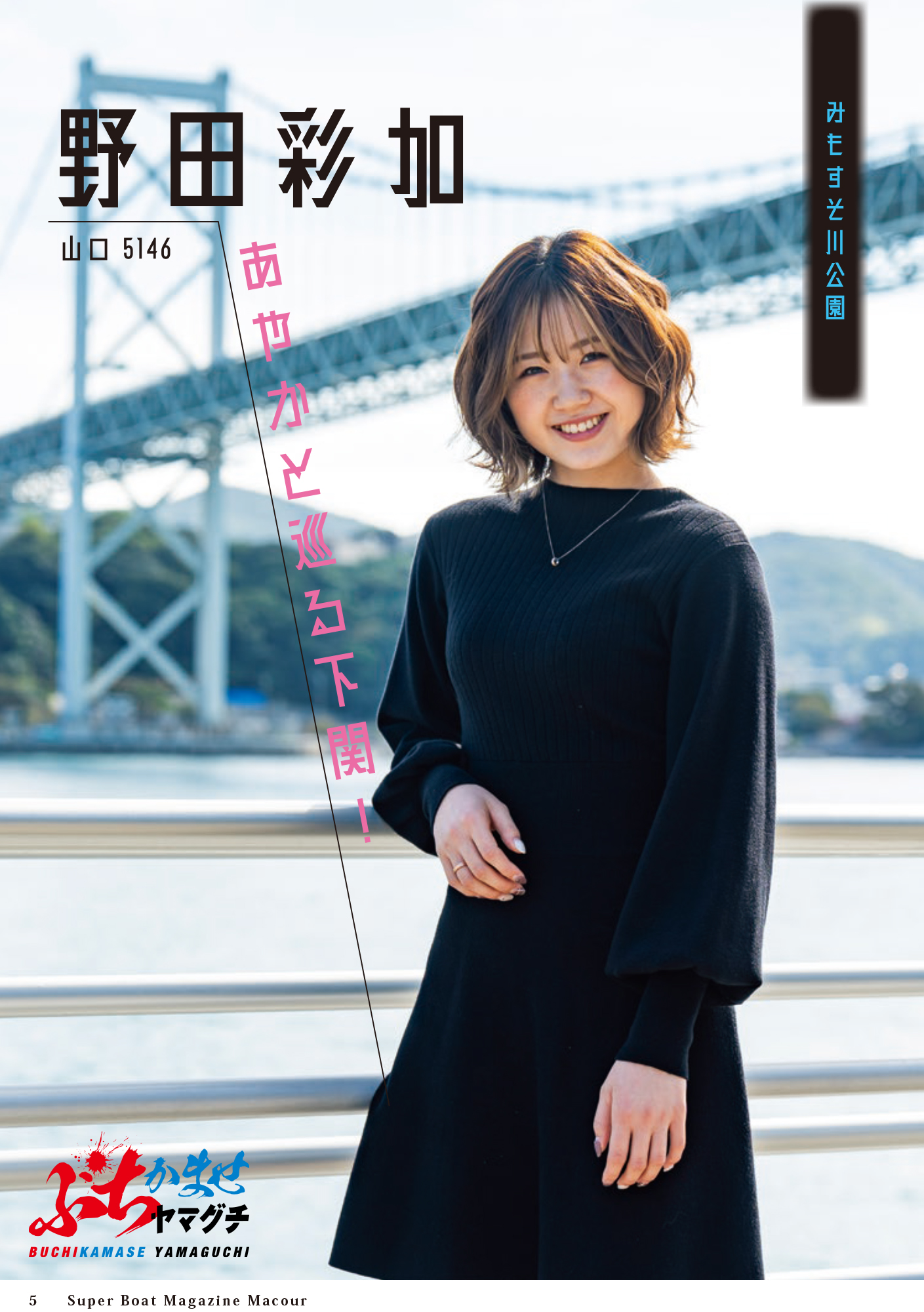 山口支部の野田彩加が登場。レーサーになってからコスメやファッションに目覚めたおしゃれ女子。デビューして間もない頃から人気があり、23年蒲郡レディースオールスターでは19歳で選出された。今回は地元の下関で撮影した。