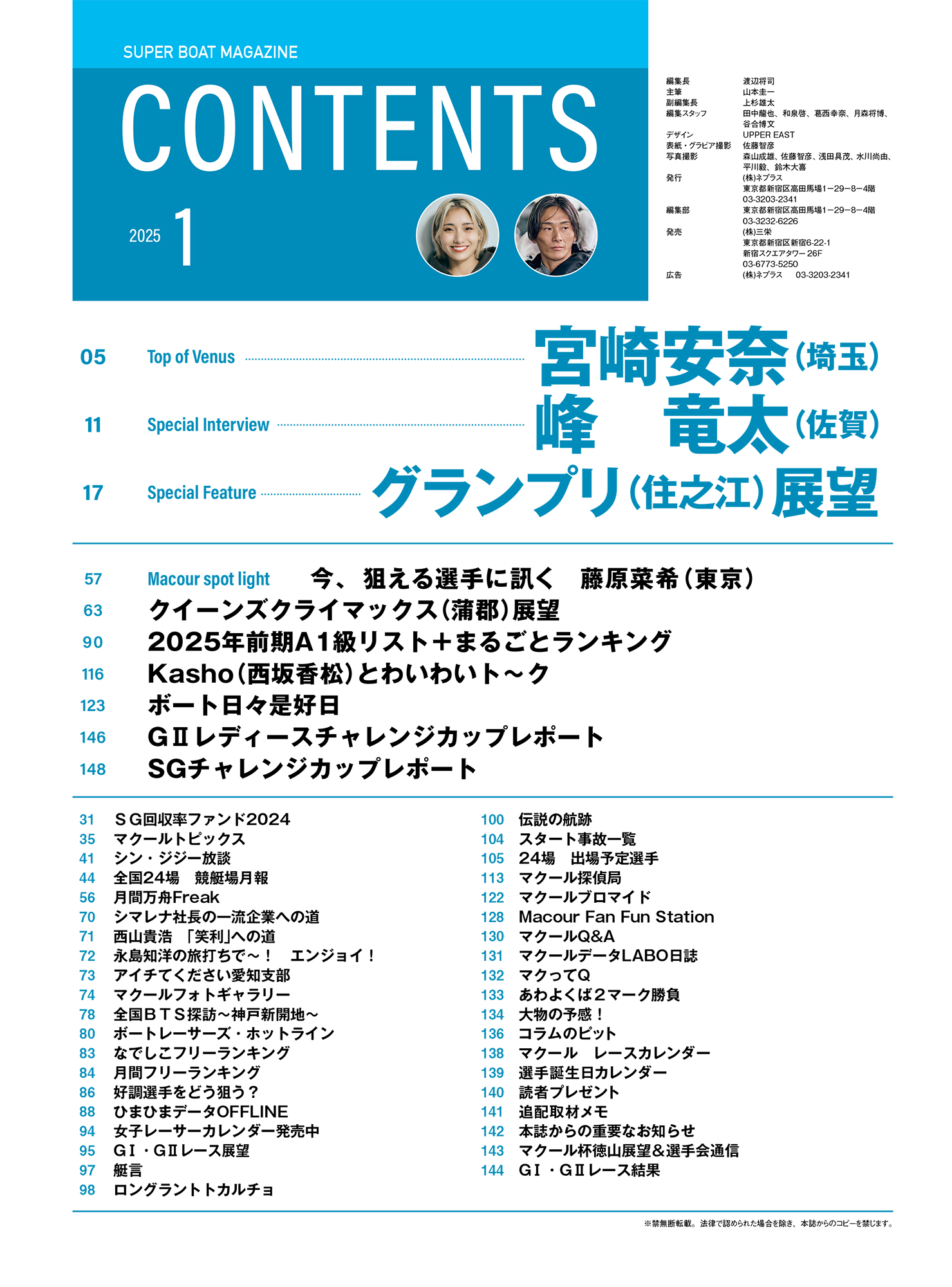 ボート界を代表する峰竜太が巻頭インタビューに登場。不調とされた1年でも賞金ランキング5位でグランプリに出場する。弟子の定松勇樹のSG制覇、オールスターファン投票1位で復帰、ダービーの敗戦、出走回数の調整など、話題に事欠かないスーパースター。大一番を前にした心境を語る。