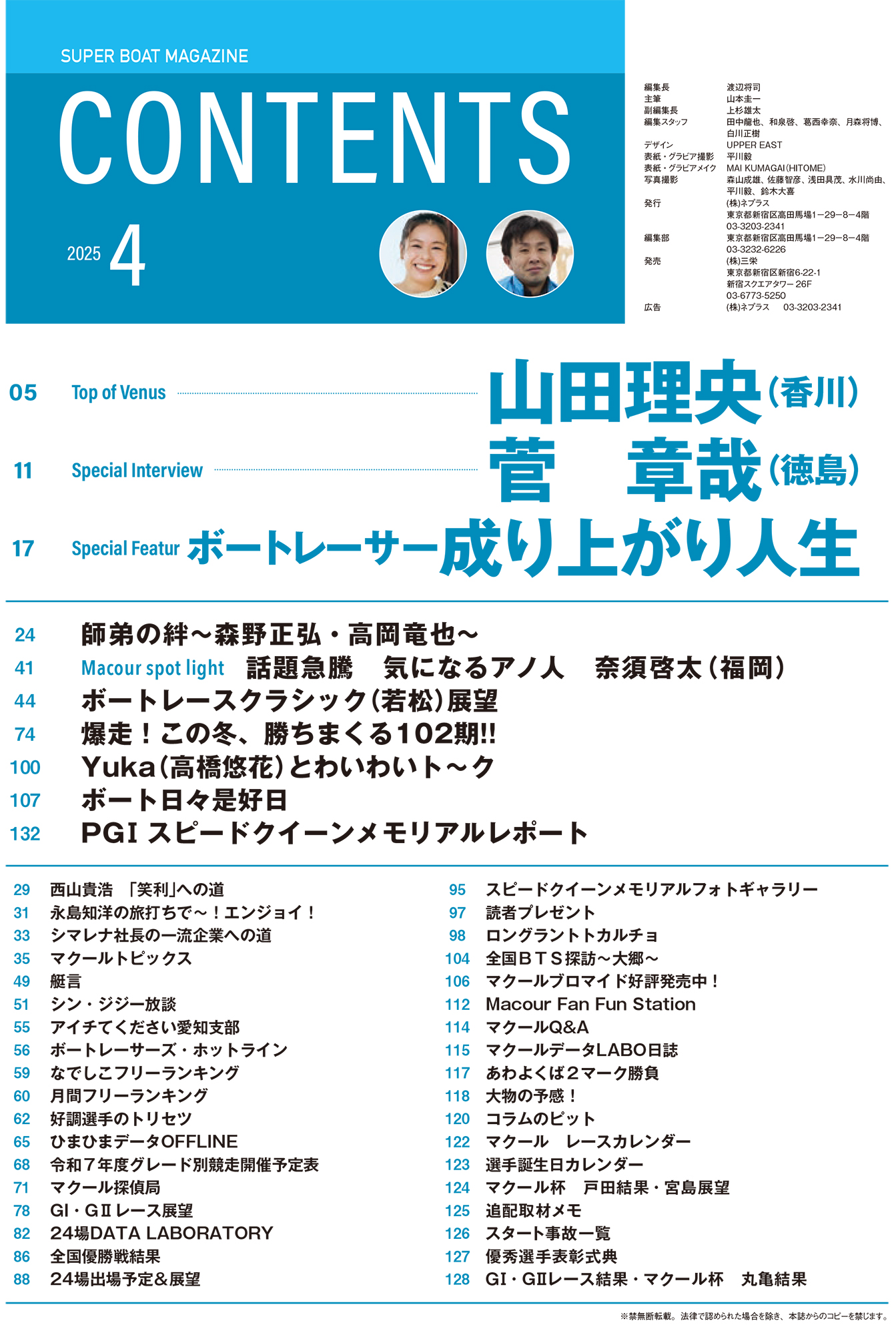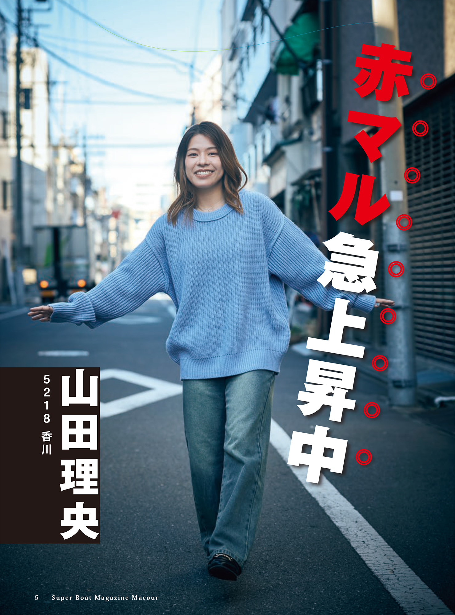 表紙&グラビアは山田理央が登場。1月からA2級に初昇格し、2月の四国地区選手権でGⅠ初出場を挙げた丸亀のフレッシュルーキー。“だーりお”の愛称で親しまれる人気・実力急上昇の気鋭が、レース場とは違う素の表情で魅せる。