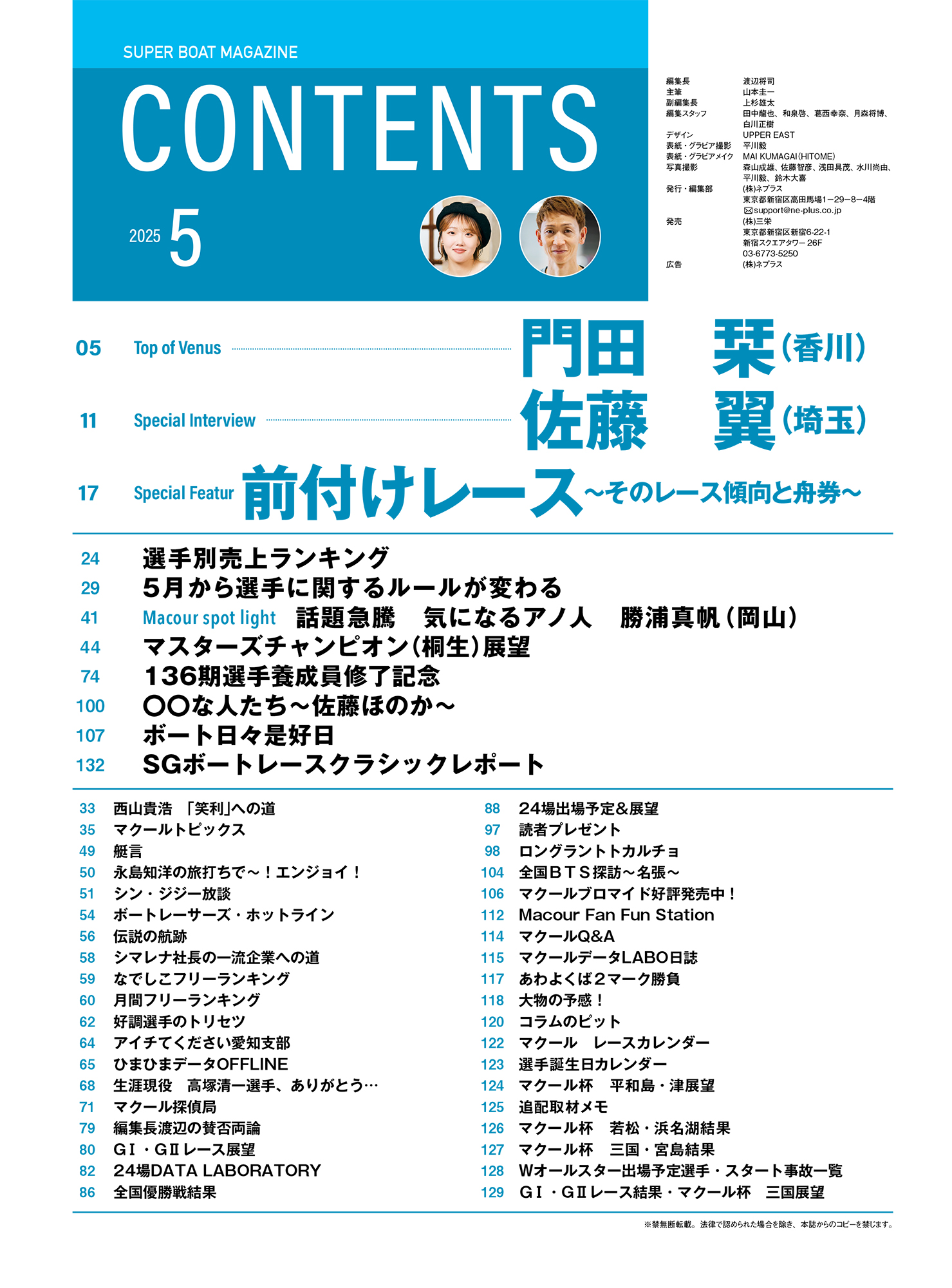 表紙&グラビアは門田栞が登場。毎期勝率を伸ばし、新期は勝率5点が目前。昨年末はクイーンズクライマックスシリーズに出場した。ガンダム好きでプラモデルもたくさん持っている。レディースオールスターにも選ばれた人気女子レーサーが素の表情で魅せる。