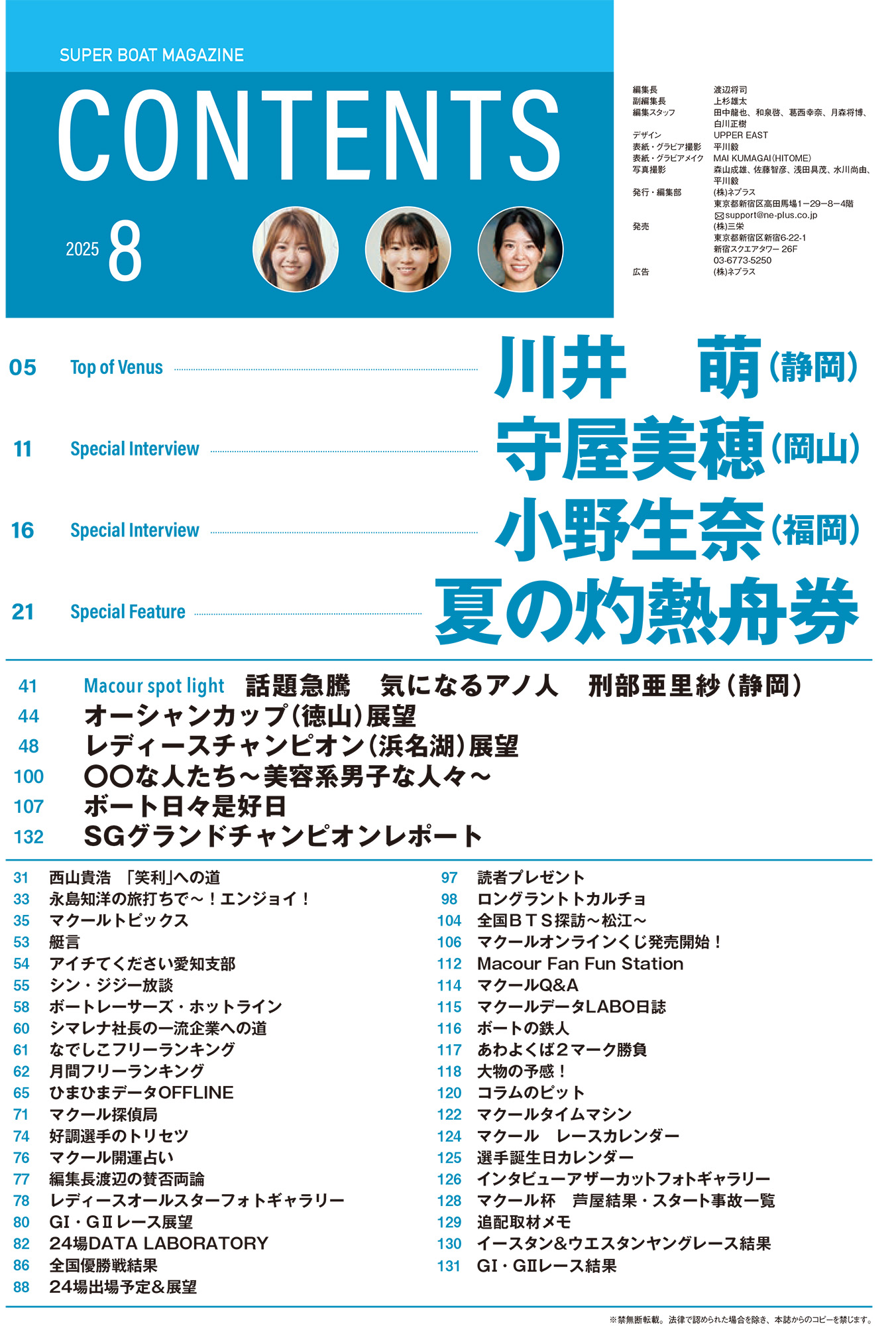 表紙&グラビアは川井萌が登場。レディースオールスター&SGオールスターに選ばれ、勝利者インタビューでは地鳴りのような歓声を浴びる人気選手。実力もうなぎ上りで、今一番注目度が高い選手。“ギャルみ”が高い、23歳の素の表情を堪能せよ!