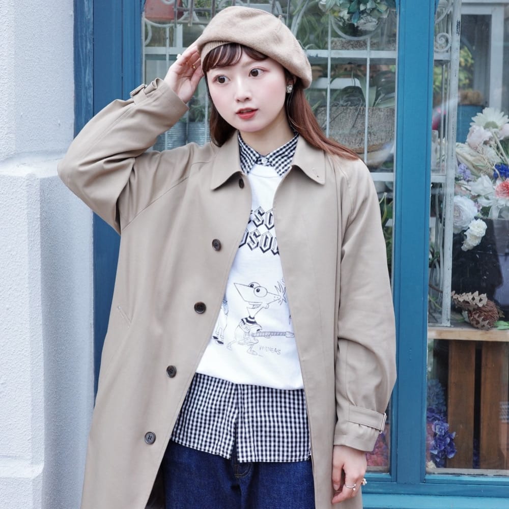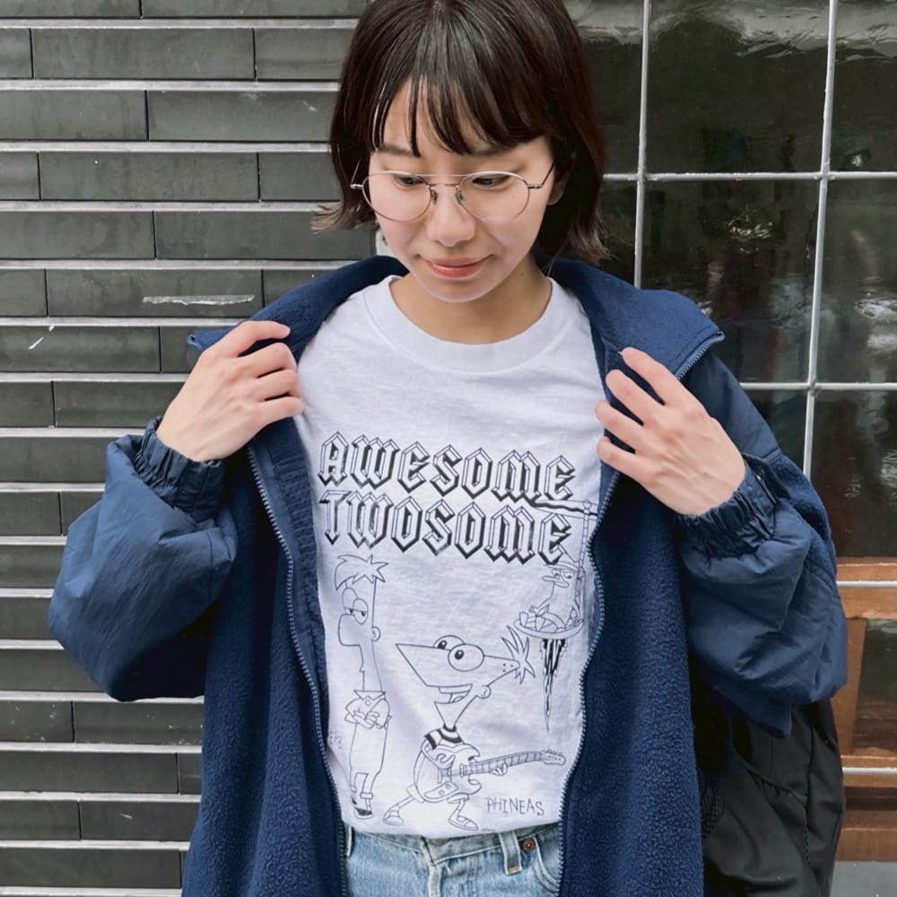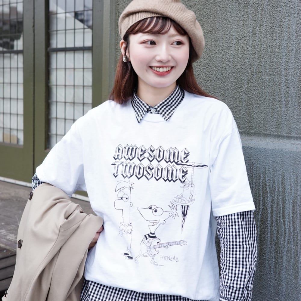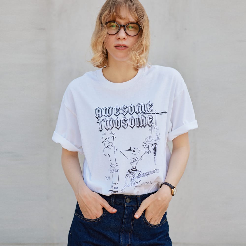 “AWESOMETWOSOME(=最高のコンビ!)”。物語の主役、フィニアスとファーブを表すロゴがインパクト大。作中でときどきバンドを結成するふたりにぴったりな、ロックTee風のデザインが刺さります。そして背後には、スパイの任務をこなすエージェントPが!やわらかくて軽い着心地ながら透け感はなし。首元のリブもしっかりしていてヨレにくく、1枚でもサマになるから、潔くデニムパンツと合わせたワン・ツースタイルで楽しみたい。