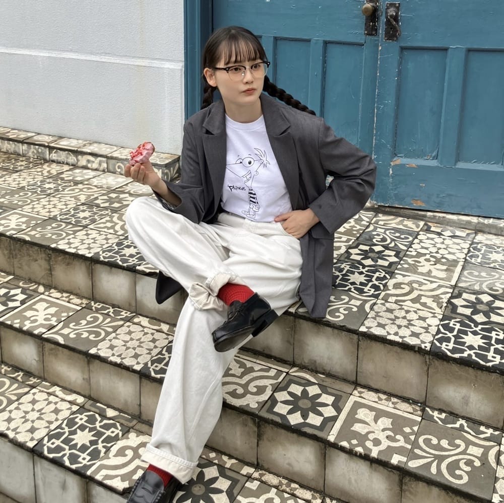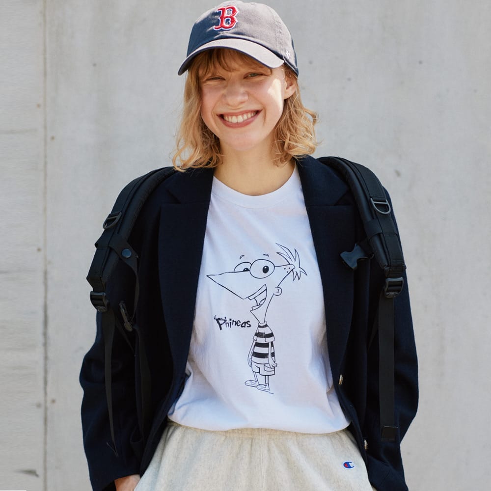 毎日ワクワクするアイデアを思いつく天才、フィニアスの姿をフロントにオン。明るく前向きな性格を彷彿とさせる、ニコニコ笑顔が愛らしい。紺ブレにスウェットパンツ、ベースボールキャップのアイビーテイストなスタイリングには、オーバーサイズのXLがベストマッチ。裾はパンツインとブラウジングで、抜け感を添えて。