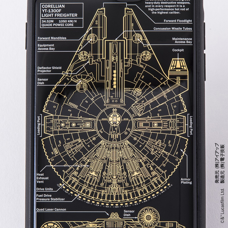 FLASHミレニアムファルコン基板アートiPhoneケースは、電池無しでファルコン号の中心部の赤色LEDが光ります。