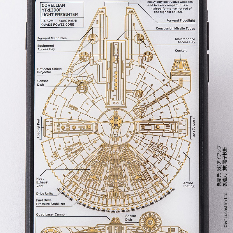 FLASHミレニアムファルコン基板アートiPhoneケースは、電池無しでファルコン号の中心部の赤色LEDが光ります。