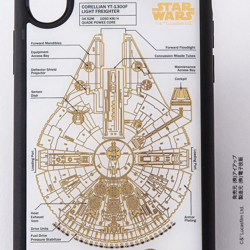 FLASHミレニアムファルコン基板アートiPhoneケースは、電池無しでファルコン号の中心部の赤色LEDが光ります。