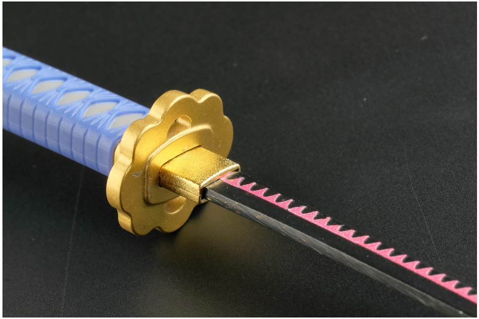 黒色の刃体に赤色の刃紋が入り、かつ、鍔も独特な形状をしたものとなっております。