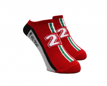 「No.509」は鮮やかなフェラーリレッド、そして伝説のカーナンバー「27」が描かれたデザインでわかるとおり1982年のフェラーリ126C2をモチーフにしたデザイン。ソール部分のグレーがシャシーサイドの色調と絶妙にリンクしているのがポイントだ。こちらも糸色選びにこだわり、イタリアントリコロールと「27 」の書体再現で何度もサンプル検証を実施。ジル・ビルヌーブ愛をそこはかとなく主張できる一足であり、あの時代のF1へのリスペクトも感じられる。