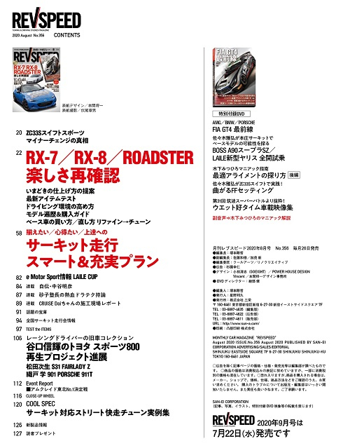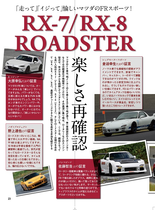 誌面特集は『FD3S RX-7、SE3P RX-8、歴代ロードスターのいま風な楽しみ方の提案』と『サーキット走行におけるスマートな過ごし方&タイム短縮法』です。『谷口信輝トヨタ スポーツ800再生プロジェクト』や『松田次生S31フェアレディZ』『織戸 学901ポルシェ』などの旧車ネタも掲載しています。