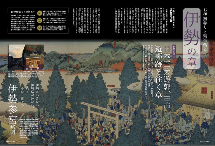 続く、伊勢の章。江戸庶民たちが祈念した一生に一度のお伊勢参り。神宮の内宮と外宮を結ぶ伊勢古市参宮街道の一大歓楽街としてあったその聖と俗の姿を今に伝える。