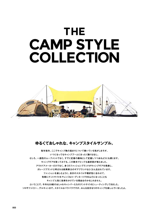 “ゆるくておしゃれな、キャンプスタイルサンプル。2021春夏”ということで、ソロやファミリー、グルキャンまで、59組のおしゃれキャンパーたちのテントサイトをシューティングしてきました。