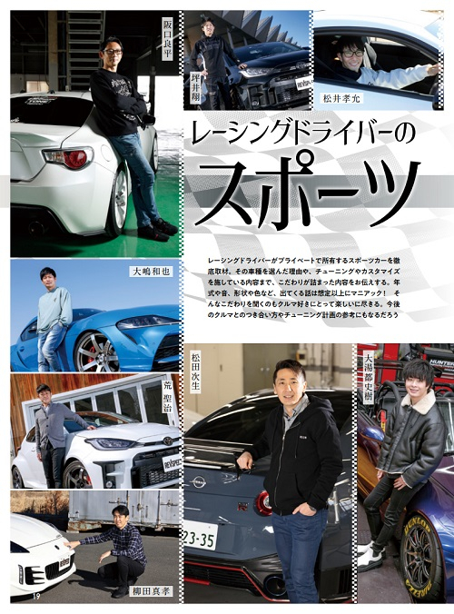 誌面は織戸 学/松田次生/脇阪寿一/荒 聖治/佐々木雅弘/柳田真孝/阪口良平/塚越広大/大嶋和也/蒲生尚弥/松井孝允/坪井 翔/久保凜太郎/大湯都史樹『プロドライバーの愛車図鑑』。