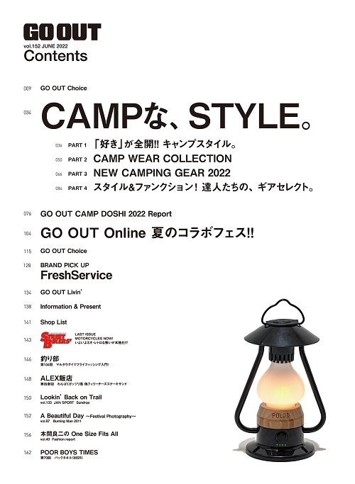 4/28(木)発売のGO OUT vol.152 6月号では「CAMPな、 STYLE。」と題して、いよいよシーズン開幕となった“キャンプな気分”を盛り上げるスタイル&ギアを大特集。さらに、毎年恒例となったGO OUT Onlineによる「夏のコラボフェス」も同時開催と、今月も内容盛りだくさんでお届けします!!
