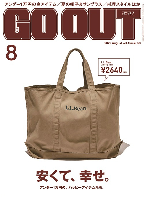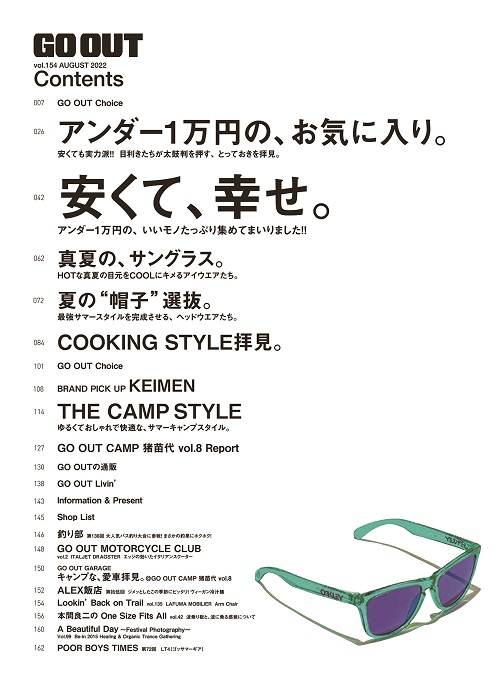 6/30(木)発売のGO OUT vol.154 8月号「安くて、幸せ。」では、アンダー1万円の良アイテムに加え、夏の必需品「帽子&サングラス」を大特集。さらに「COOKING STYLE拝見」、「サマーキャンプスタイル」、「キャンプな愛車拝見」と、今月も内容盛りだくさんでお届けします。