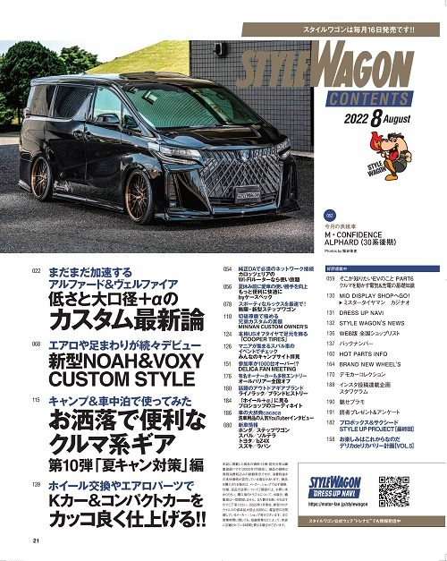 今月のスタイルワゴンの巻頭特集はミニバン王者「アルファード&ヴェルファイア」のカスタム最新論。次期モデルの噂もあるが、現行30系のカスタムがまだまだ熱い! 意識高い系ユーザー達のホイール&タイヤマッチングや乗り心地重視の足まわりなど、最新スタイルを大ボリュームでお届け。もちろん話題の新型ノア&ヴォクシーや人気爆発中のジムニーなど、様々な車種のドレスアップ情報満載。キャンプ&車中泊の夏の暑さ対策などもあるぞ!