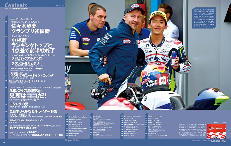 参戦6年目。第11戦オランダGPで初優勝を飾ったMoto3佐々木歩夢。チームオーナーのマックス・ビアッジと笑顔で写真に収まった。