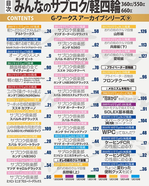 月刊G-ワークスの誌面を飾ったサブロク/軽四輪の掲載ページを集めて編集。スバル360やR-2、スズキフロンテ/セルボ/アルト、マツダキャロル、ホンダライフ/N360などなどを余すところなく掲載。さらにソレックスキャブをカットして中をわかりやすく掲載したページ、ケーヒンFCR、点火プラグテスト記事などの厳選記事を1冊にまとめました。好きなサブロク/軽四輪旧車だけが見られる唯一無二のムック!!この内容は見逃せない!!
