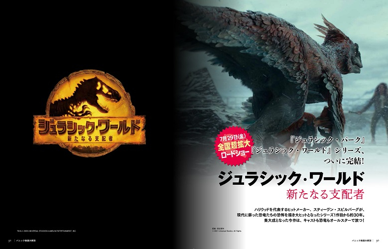 本誌はパニック映画の歴史から60年代?2020年代までのパニック映画を一挙に紹介するとともに、7月29日より公開される「ジュラシック・ワールド」含むシーリーズ全5作を大特集する。