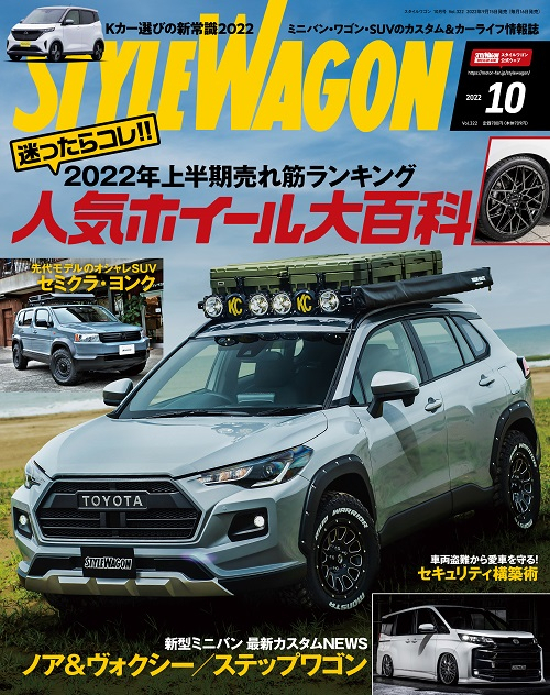 - スタイルワゴン10月号は、愛車のドレスアップに欠かせないホイール&タイヤの売れ筋がわかるパーフェクトガイドが巻頭特集。2022の上半期ランキングからこの秋発売予定の新作までをフォロー。話題の新型ミドルクラスミニバンのホイールマッチングもあり。さらに今買える新型Kカー選び、これrからシーズンインをむかえるキャンプ&アウトドア特集、ちょっと懐かしい2000年代のセミクラヨンク、愛車を守るセキュリテなど、ボリューム満点でお届け! CONTENTS 1 表紙 3 目次 4 迷ったらコレ!! 2022年上半期売れ筋ランキング 人気ホイール大百科 36 新型ステップワゴンの純正アクセサリーに注目! 41 そこが知りたいEVのこと PART8 BEVの先鞭つけたTESLAを詳しく! 49 待望のボディキットが続々デビュー! 90系NOAH&VOXY HOT NEWS 66 ASOMOBI in MAKUHARI 70 セカンドカーとして狙うのもアリ! 軽カー選びの新常識2022 78 新車情報 81 キャンプ&車中泊で使ってみた お洒落で便利なクルマ系ギア 第12弾「BBQグリル&調理器具」編 86 MID DISPLAY SHOPへGO! 87 DRESS UP NAVI 88 STYLE WAGON’S NEWS 92 WEB版 全国ショップリスト 93 バックナンバー 94 奥付 95 20年落ちの今が渋い! 2000年代のSUVをお洒落にカスタム セミクラヨンクに乗る! 106 盗まれてからでは遅い……大切な愛車を魔の手から守るためのセキュリティ構築術 112 デリカキャンプ2nd 120 デモカーコレクション 128 HOT PARTS INFO 132 ラリー北海道2022 FLEX SHOW AIKAWA Racingの挑戦 134 Gunma HARRIER Meeting 138 お楽しみはこれからなのだ デリカdeリカバリー計画【VOL.7】 140 HOMURA×COLT SPEED 珠玉の3本履き比べ 142 ホイール+αに見るプロショップのコーディネイト 144 インスタ投稿連載企画 スタワグラム 146 魅せプラモ 147 読者プレゼント&アンケート