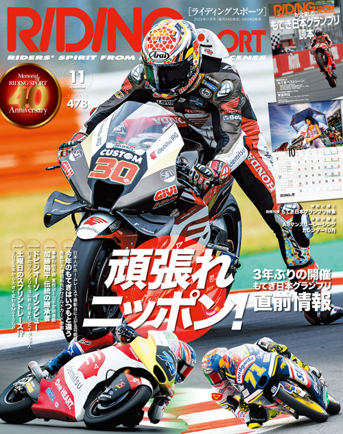 ライディングスポーツ2022年11月号の目次。写真はMotoGP第13戦オーストリアGPで今季2勝目を挙げた小椋藍。レース終盤はチームメイトのソムキャット・チャントラと一騎打ち。ドラマのような見せ場を作った。