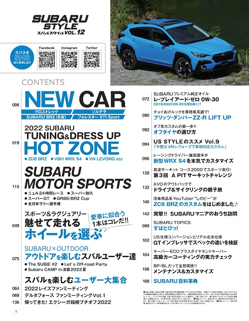 巻頭特集は、BRZ、WRX S4、レヴォーグとここ最近のスバル車を代表する新型車のチューニング情報やエアロパーツなどのドレスアップパーツを一挙に紹介。