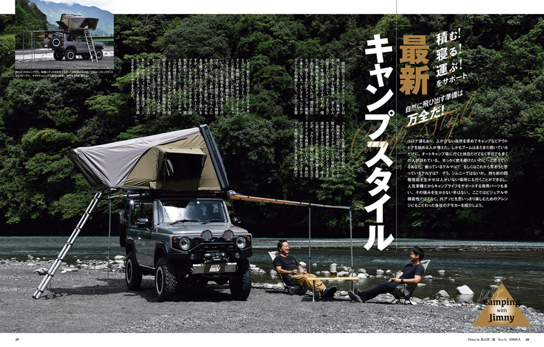 今回のハイパーレブ・ジムニー&ジムニーシエラは最新のキャンプスタイルについて大特集。持ち前の機動性を生かし道なき道を突き進むジムニー。人気車種だからこその専用のキャンプパーツも多く出揃い、まさに今が旬。ビジュアルや機能性だけではなく、外遊びに思いっきり楽しむためのアレンジにこだわった各社のデモカーを紹介しよう。