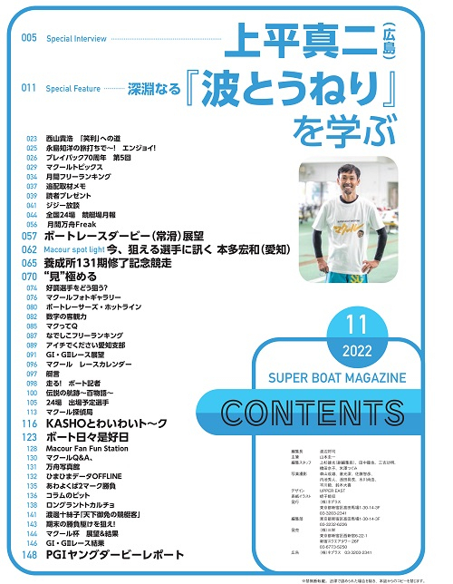 一昨年の秋、1マーク後方に防風ネットが設置され、合わせてスタンドも改装された常滑。秋の静かな水面に、全国からダービー戦士が集結する。彼らを迎え撃つ地元・愛知勢は強力だ。さらにここから、年末の賞金戦線も佳境に入って行く。そして今回は地元ダービーでSG初出場する本多宏和にインタビューをした。