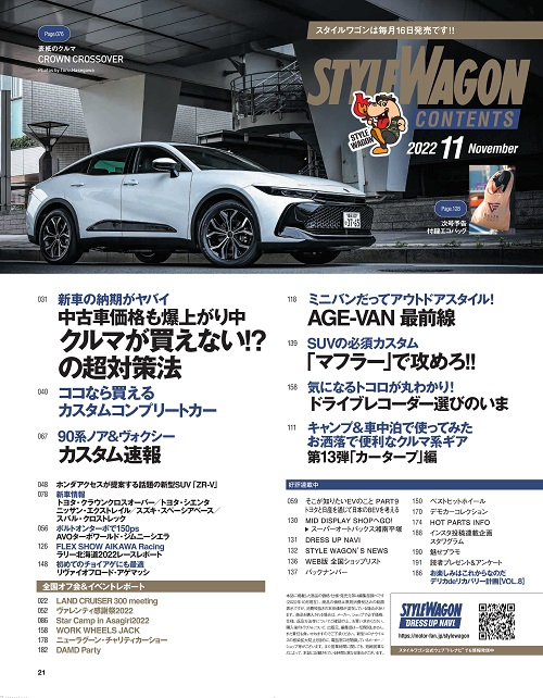 もちろん人気のアウトドア系コンテンツも充実。ミニバンでやる「アゲバン」スタイルの提案や、キャンプで便利なカーサイドタープもピックアップ。SUVカスタムで欠かすことができない「マフラー」や、今や愛車に必須となっているドライブレコーダーも。今月号も情報盛りだくさんでお届け。