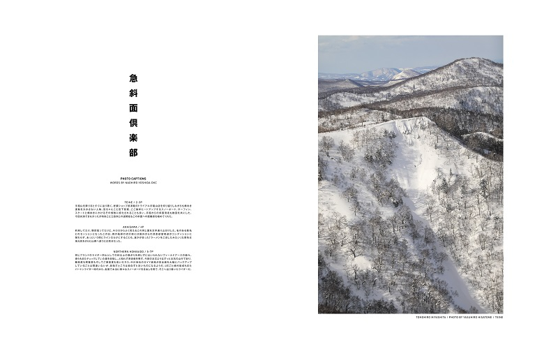 その大半の目的地となるリゾートとは違った表情に迫る今号は、一部のマニアしか触れることのない奥深い山塊であったり、華やかさとは無縁の生活に組み込まれた辺地ローカルのリアルなスノーボードライフ、トップライダーたちが狙い続けてやっと到達できた山域でのセッションなど、広大な北海道のまだ見ぬスウィートスポットを舞台にしたストーリーの数々でお届けします。