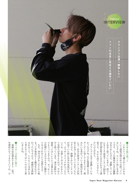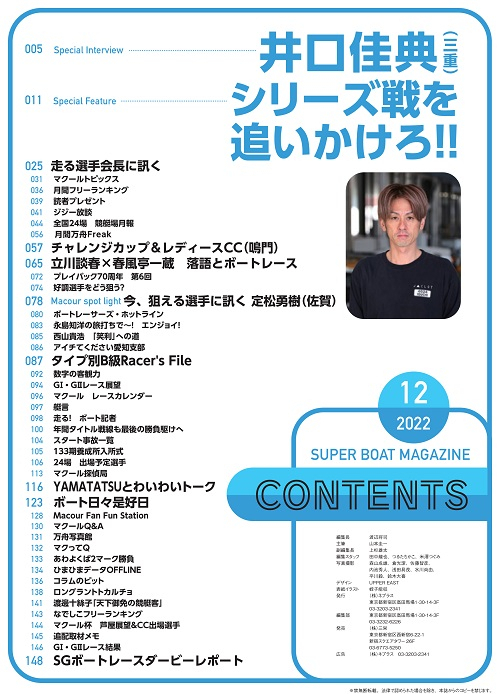 今回の巻頭インタビューは井口佳典。今年の賞金ランキングでは20位台につけ、チャレンジカップで勝負駆けとなっている近況。そして2ヶ月の出場停止と1年間のSG選出除外を受け、先日のボートレースダービーでSG復帰を果たしたばかり。その間の気持ちやファンに向けてのメッセージも掲載している。