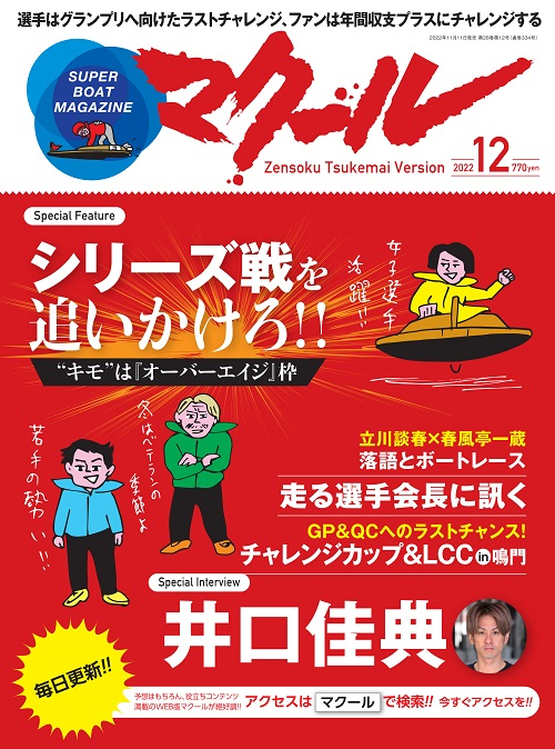 今夏より選手会長になった瓜生正義にインタビューを実施。選手会長としての考えを聞いた。そして9月に真打ちへと昇進したボート大好き落語家・春風亭一蔵師匠。その昇進祝いに立川談春師匠が駆けつけてくれた。「落語とボートレース」対談。もちろん年末最大の勝負駆け、チャレンジカップもガッツリ展望!