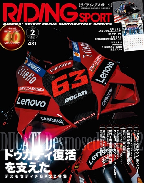 ライディングスポーツ2023年2月号の目次。写真は、2022MotoGPタイトルを獲得したフランチェスコ・バニャーヤ。