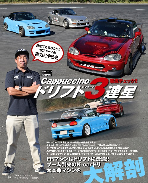 すでにネオノスタルジックと言える世代でありながら、未だにマニア人気の衰えぬカプチーノ。この車種の最大の特徴といえる、FRのレイアウトを活かすならドリフト。というわけでドリフト仕様車3台を集め、D1ドライバー、チームオレンジの末永ナオトが試乗インプレッション。