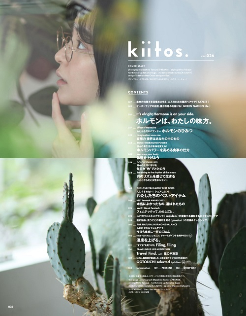 ウェルネス&ビューティマガジン『kiitos.(キイトス)』最新号vol.26が発売中! 私たちの身体に生まれながらに備わり、日頃の体調やお肌、心の状態にまで大きな影響を与え続ける「ホルモン」。女性ホルモンやホルモンバランスという言葉にはなじみがあっても、実際には知らないことだらけ。ストレスに果敢に立ち向かう「コルチゾール」、未体験へのチャレンジが大好きな「ドーパミン」、体内時計と密接に関わり安眠をもたらす「メラトニン」、脳を活性化させ気持ちを安定させる「セロトニン」など、ベストな心身をキープするための最強のサポーターであるホルモンの働きをあらためて見つめ直せば、そこには彩り豊かに生きるためのヒントがいっぱい詰まっています!