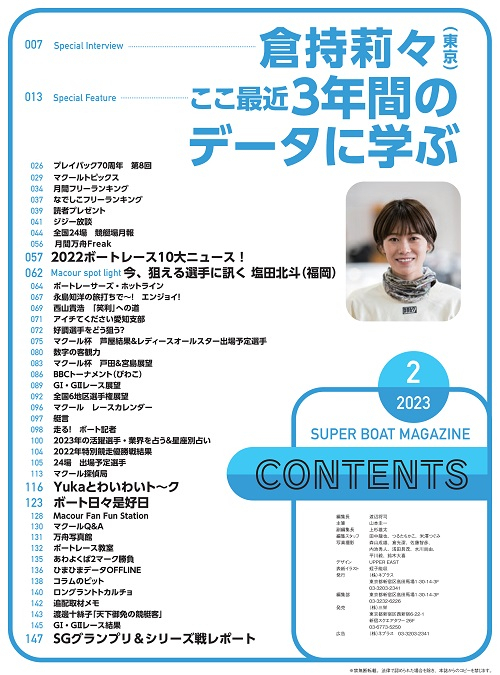 今回の巻頭インタビューは倉持莉々。22年はオールスターでSGデビュー、初優勝の水神祭、女子最高勝率をマーク。その一方で怪我も経験するなど、いいことも悪いことも経験した。2月に蒲郡で行われるレディースオールスターでは、ドリーム戦に選ばれるほどの人気選手に成長。今年は年末にクイーンズクライマックスが多摩川で開催されるだけに、年間を通して注目の存在となりそうだ。