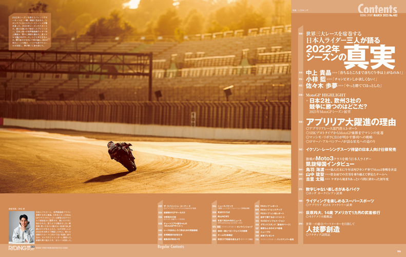 ライディングスポーツ2023年3月号の目次。写真は、2022年シーズンを終えたバレンシアサーキット。新たな顔ぶれで始まったプレシーズン。日本人唯一の世界最高峰ライダー中上貴晶も、黙々と周回を重ねた。柔らかな太陽の光がサーキットごと中上を包んだ。