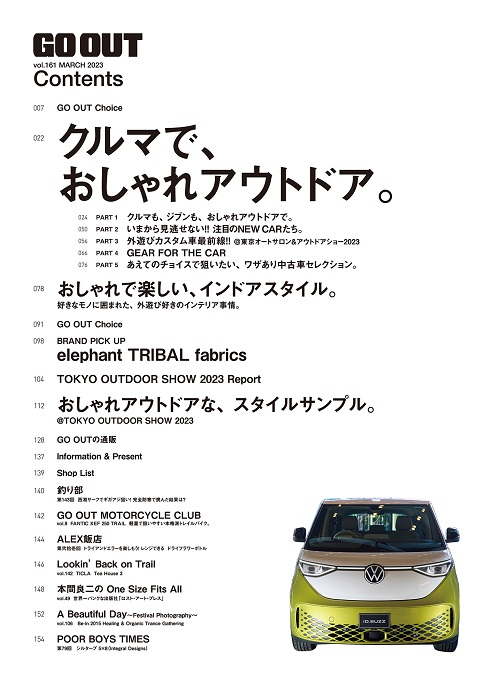 1/30(月)発売のGO OUT vol.161 3月号「クルマで、おしゃれアウトドア。」では、達人たちの愛車スタイルから新旧モデルまで、おしゃれアウトドアなクルマSTYLEを大特集。さらに、おしゃれなカーグッズ、TOKYO OUTDOOR SHOWでのスタイルサンプルと、今月も内容盛りだくさんでお届けします。